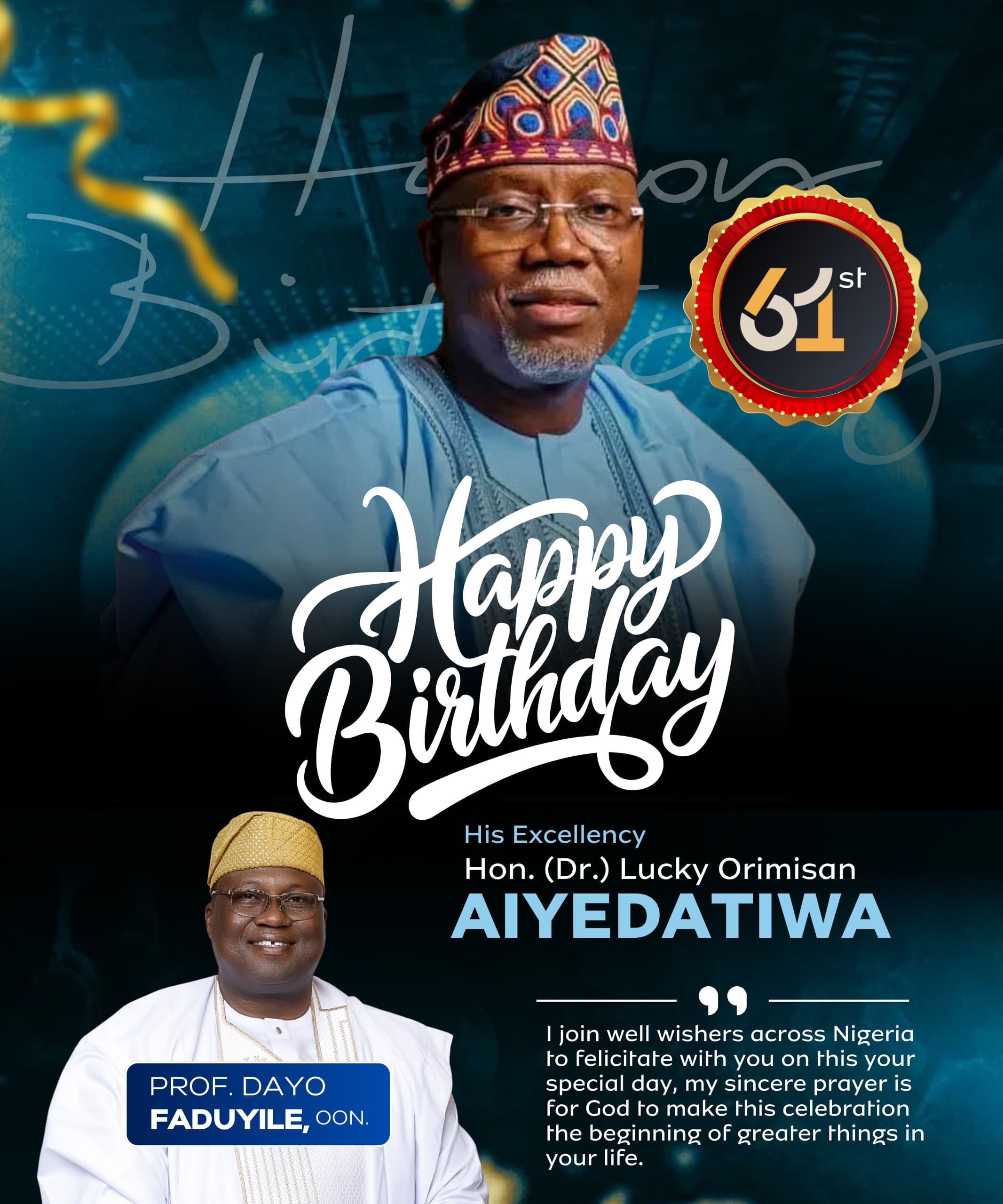 All Progressives Congress, APC stalwart from Ondo South, Prof. Dayo Faduyile, OON, has extended his hearty greetings to Ondo State Governor, His Excellency, Lucky Orimisan Aiyedatiwa on the occasion of his 61st birthday.
