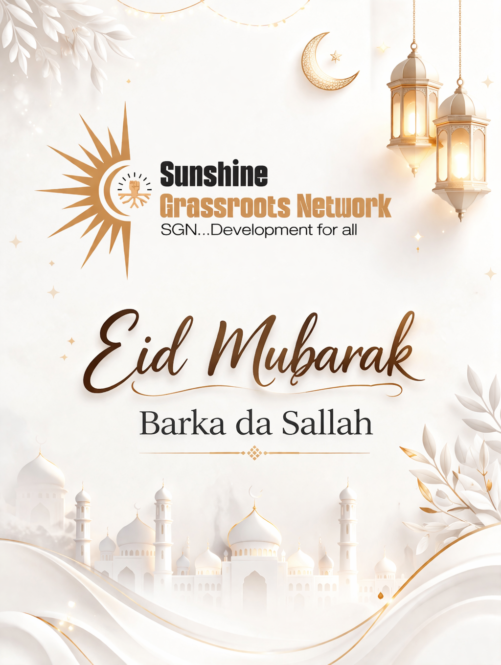 As Muslims celebrate this important festival, the Sunshine Grassroots Network wishes all faithful a peaceful and fulfilling Eid, praying that the season brings renewed hope, progress, and lasting prosperity to every home.